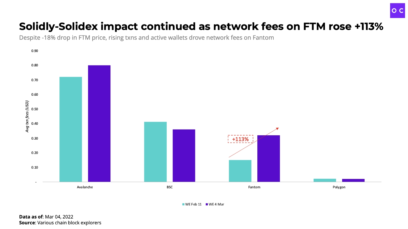 Solidly-Solidex 的高增长推动 Fantom 网络费用飙升,在截至 3 月4日的三周内上涨了 +113%