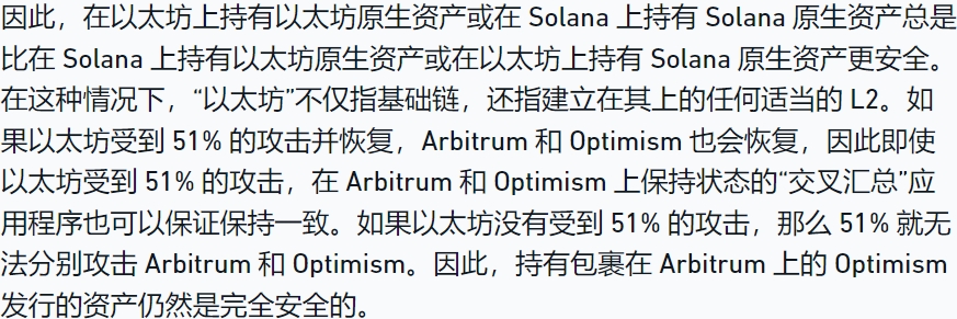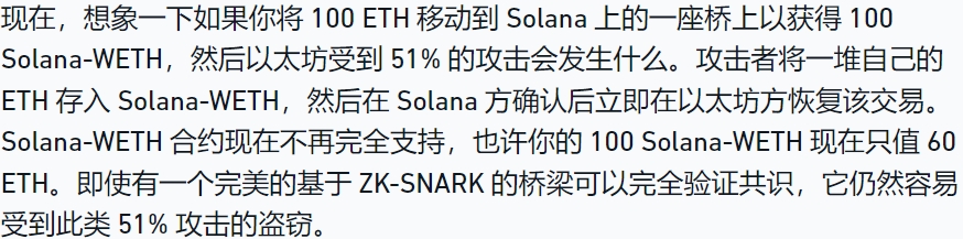 通过上面的例子,Vitalik 建议通过将以太坊资产桥接到 Solana,如果以太坊受到 51% 的攻击,它就很容易被盗。